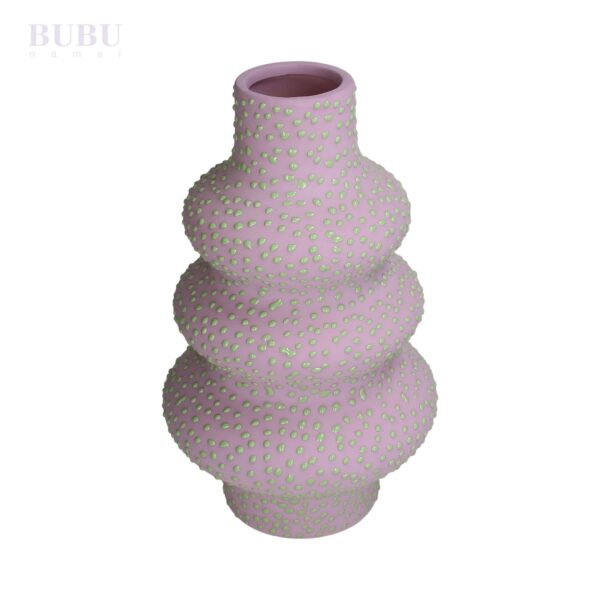 Ši akmens masės vaza traukia akį alyvine spalva ir iškiliais žalsvais taškeliais, kurie suteikia jai žaismingumo. Trijų pakopų banguota forma pabrėžia modernų charakterį, todėl ši detalė lengvai tampa ryškiu akcentu namuose. Interjero entuziastai Bubunamai parduotuvėje atras, kad spalvų derinys puikiai dera tiek moderniame, tiek eklektiškame stiliuje.