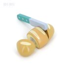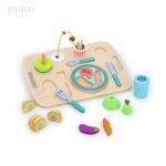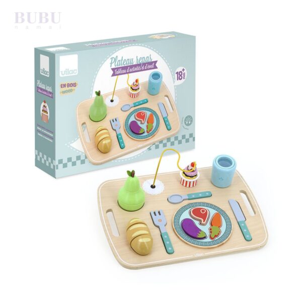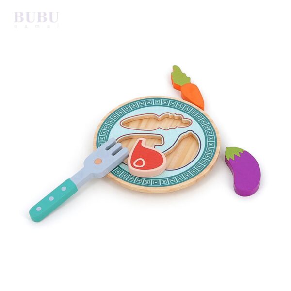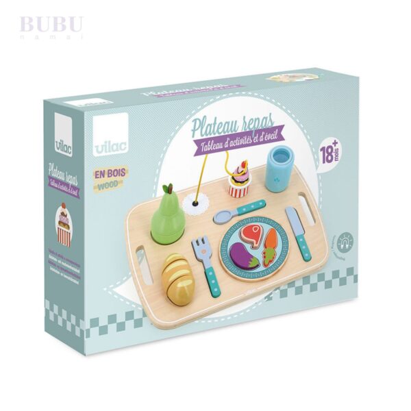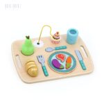 Ant šios žaismingos daugiafunkcės medinės pietų lėkštės nieko netrūksta: barškučio formos gėrimas, pjaustoma duonelė su lipduku, įstatomi mėsos ir daržovių gabalėliai bei sudedama kriaušė desertui.
