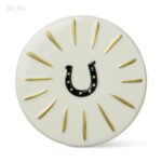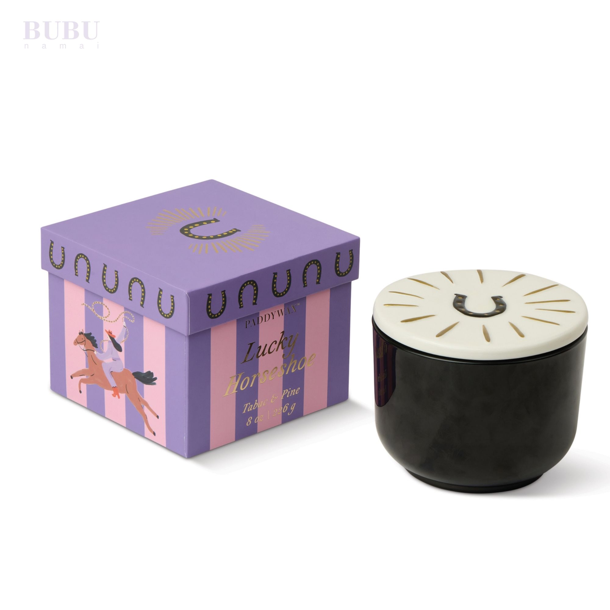 Juodo stiklo žvakė su keramikiniu dangteliu „Laimės pasaga“ tabako ir pušies kvapo