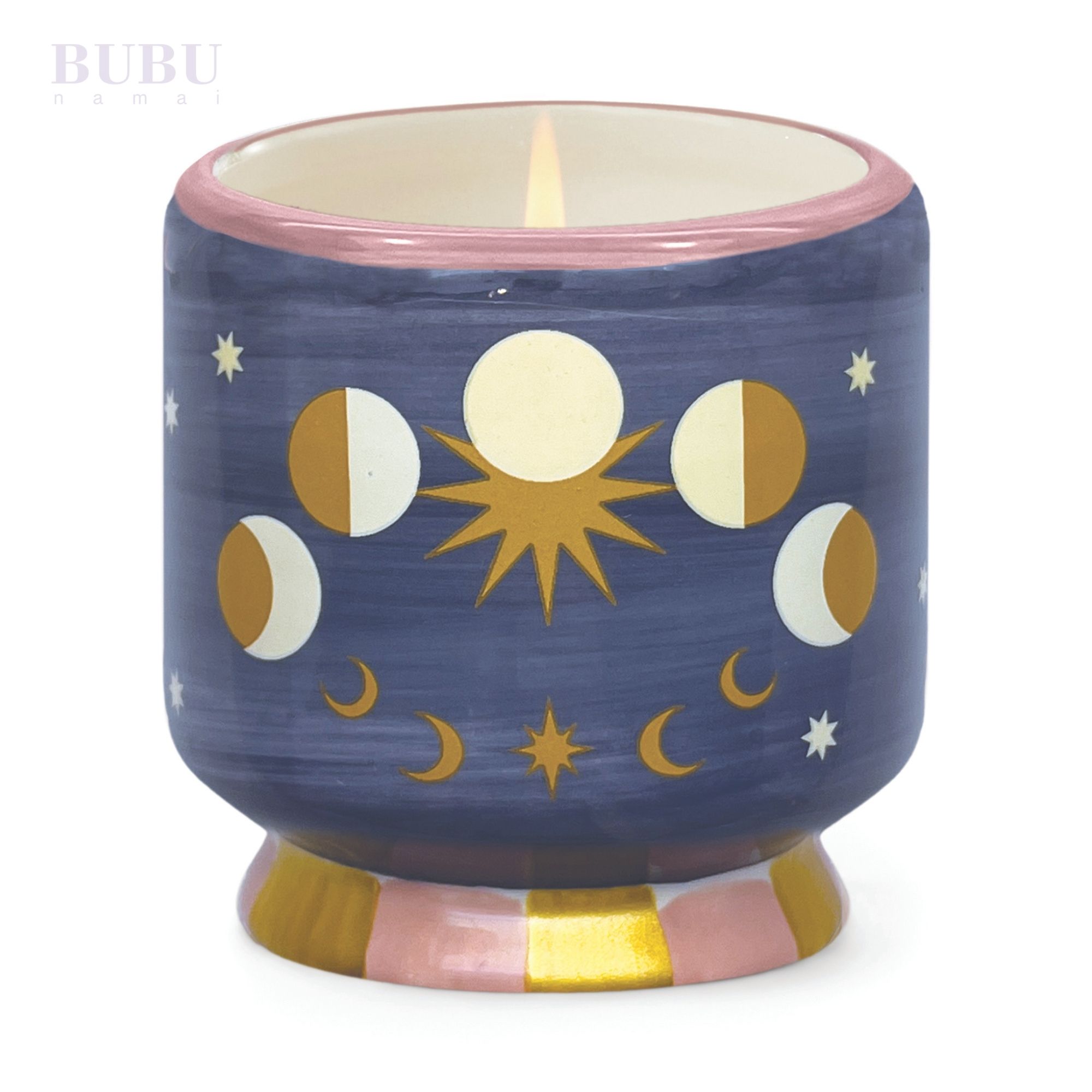 Keramikinė kvepianti soju vaško žvakė „Mėnulio ciklai“ – tai Viduržemio jūros vasaros įkvėpta interjero detalė, kuri namams suteikia gaivos, spalvų ir nuotykių nuotaikos. Ryški, Maroko motyvais dekoruota 226 g (8 oz) keramikinė talpa yra kruopščiai rankomis tapyta, todėl kiekviena žvakė – unikali ir turinti amatininkišką charakterį.