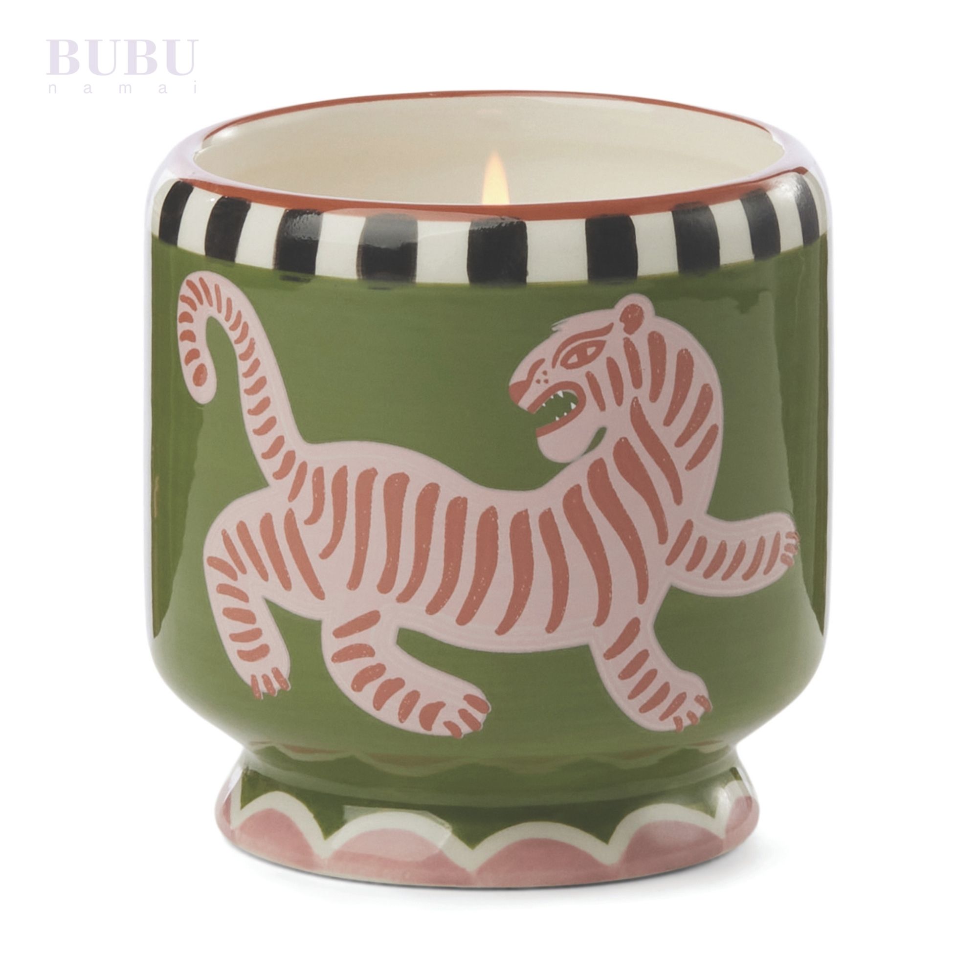 Keramikinė kvepianti soju vaško žvakė „Tigras“ – tai Viduržemio jūros vasaros įkvėpta interjero detalė, kuri namams suteikia gaivos, spalvų ir nuotykių nuotaikos. Ryški, Maroko motyvais dekoruota 226 g (8 oz) keramikinė talpa yra kruopščiai rankomis tapyta, todėl kiekviena žvakė – unikali ir turinti amatininkišką charakterį.
