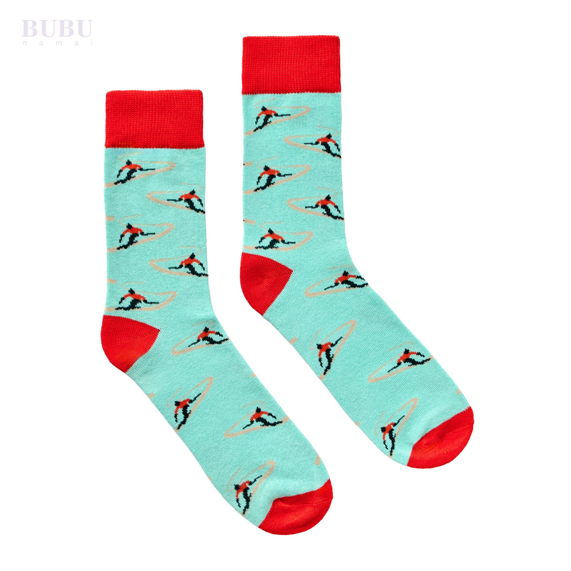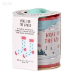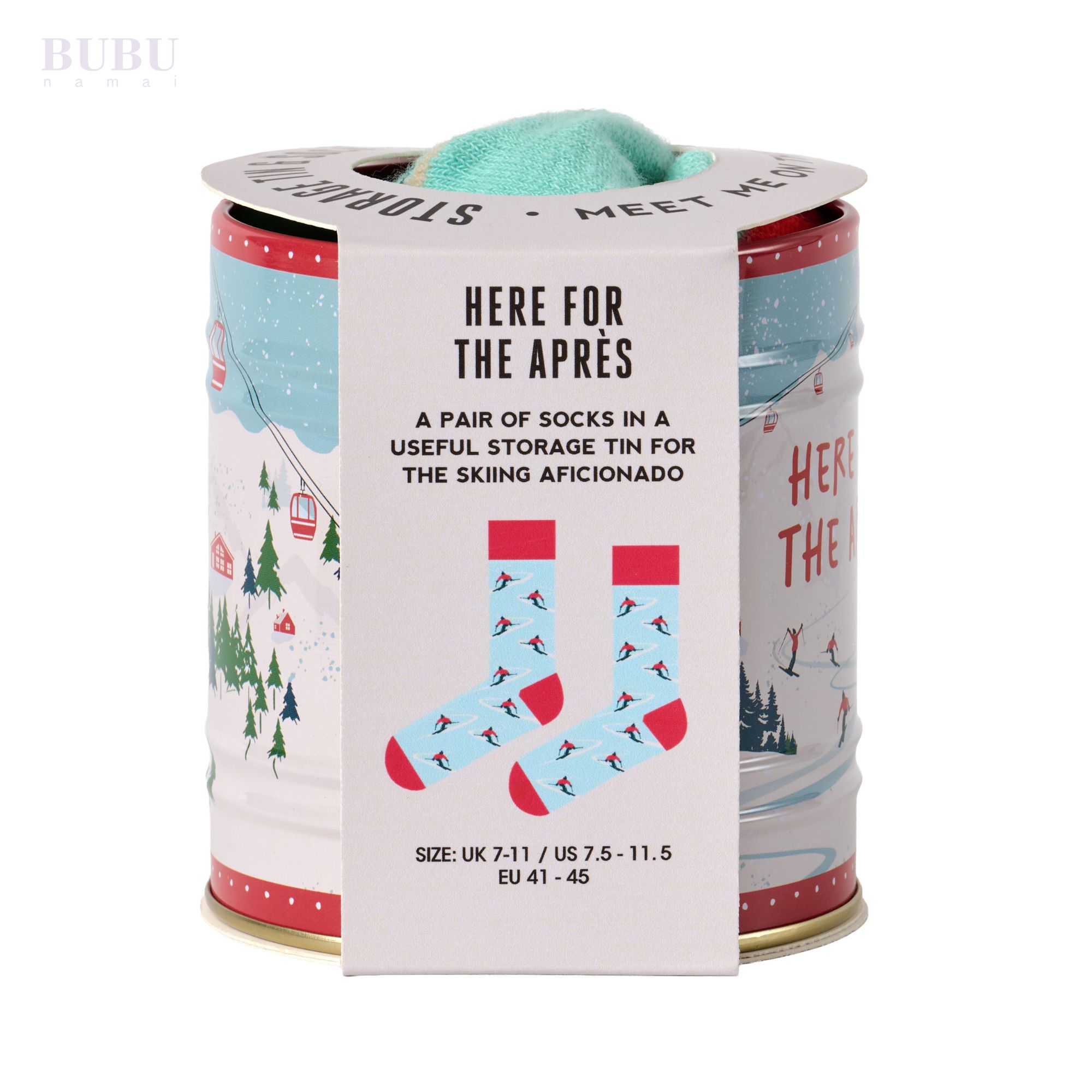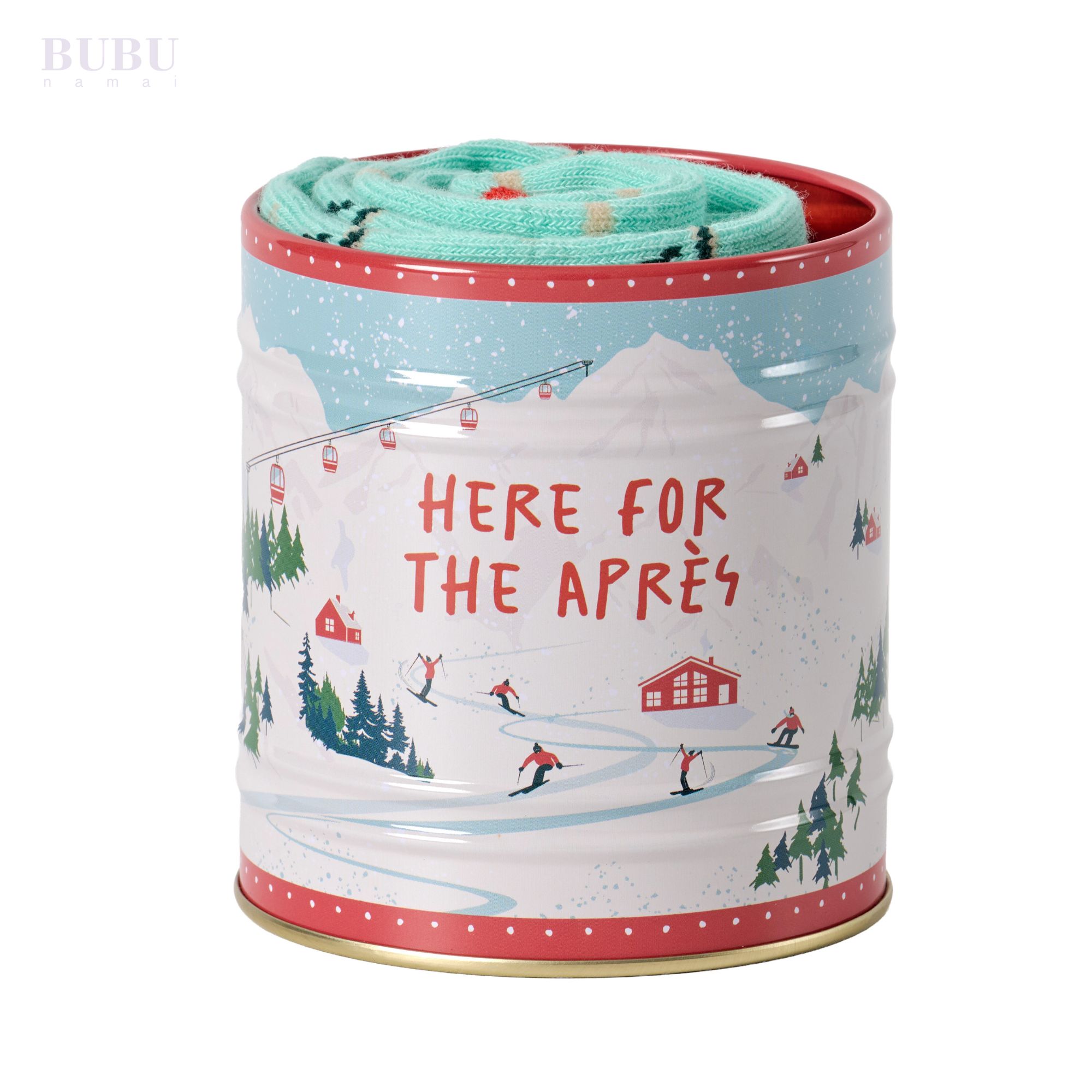 Žiemiškos nuotaikos kupinas kojinių rinkinys skardinėje, sukurtas slidinėjimo ir kalnų pramogų gerbėjams. Švelnios mėtų spalvos kojinės su dinamiškais slidininkų motyvais ir kontrastingomis raudonomis detalėmis suteikia žaismingumo bei jaukumo, o minkštas ir patogus audinys užtikrina komfortą tiek aktyviai dienai, tiek poilsio akimirkoms.