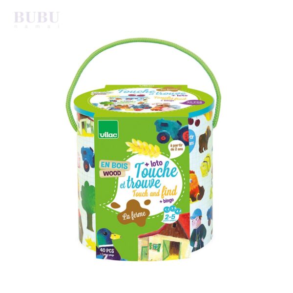 Lytėjimo pažinimo žaidimas, kuriame reikia įkišti ranką į maišelį ir surasti norimas detales pagal pojūtį. Rinkinyje yra 21 medinė detalė ir 20 iliustruotų kortelių. Žaidimą galima naudoti ir kaip loto. Dėžutėje rasite instrukcijas 5 kalbomis.