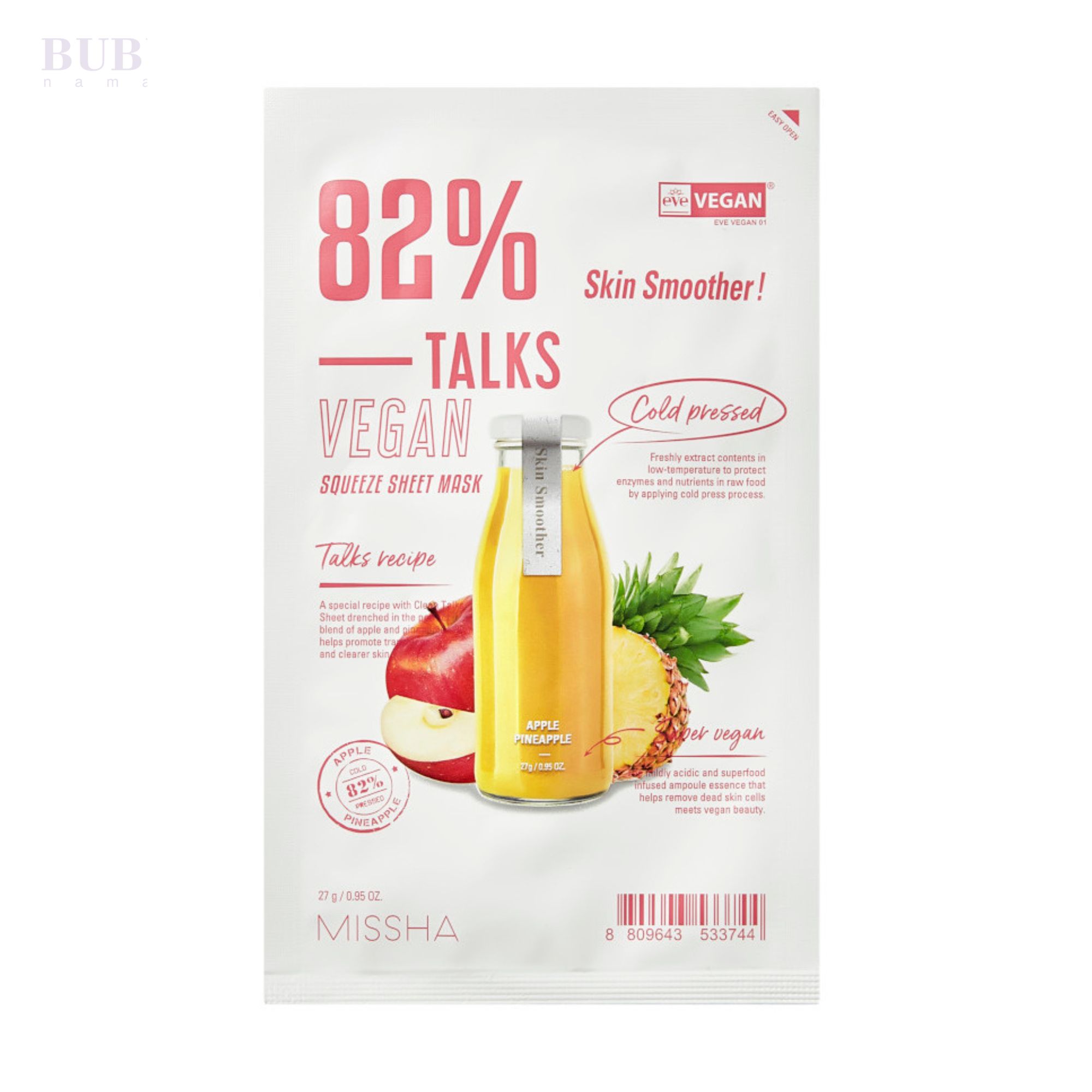 Veganinė lakštinė veido kaukė, skirta švelniam odos šveitimui ir glotninimui. Sudėtyje esantis obuolių ir ananasų ekstraktų derinys padeda pašalinti negyvas odos ląsteles, suteikia odai švelnumo ir skaistumo.