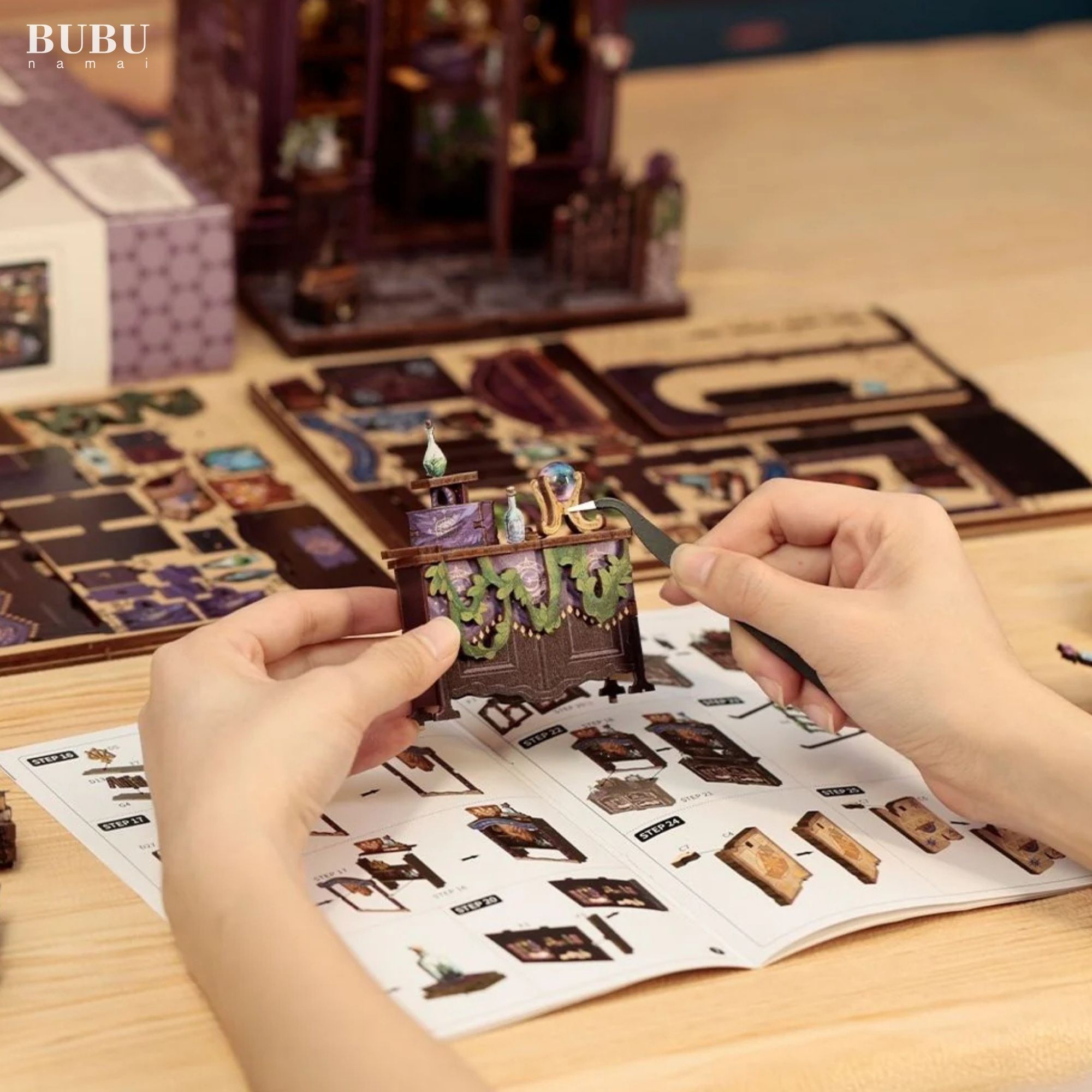 • Komponentai – visos dalys, reikalingos detaliam ir kruopščiam „Book Nook“ sukurti