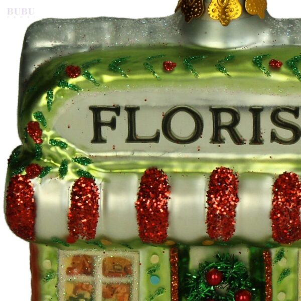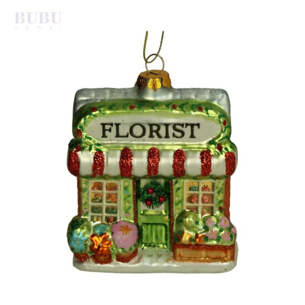 Žavingas stiklinis Kalėdų eglutės žaisliukas – floristinės parduotuvės formos ornamentas. Spalvingi gėlių motyvai, raudoni ir žali blizgantys akcentai suteikia jam ypatingo šventiškumo bei jaukumo. Ši dekoracija ne tik papuoš jūsų eglutę, bet ir sukurs nostalgišką, pasakišką atmosferą. Bubunamai siūlo šį ornamentą kaip puikią dovaną ar stilingą akcentą jūsų šventiniam dekorui.