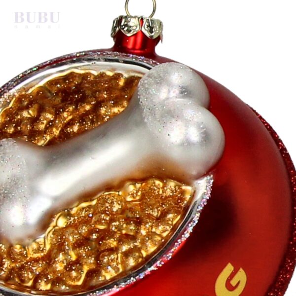 Bubunamai siūlo išskirtinį stiklinį Kalėdų eglutės žaisliuką – raudoną šuns dubenėlį su kaulu. Žaismingas ir originalus ornamentas pradžiugins visus augintinių mylėtojus bei suteiks eglutei išskirtinio žavesio.