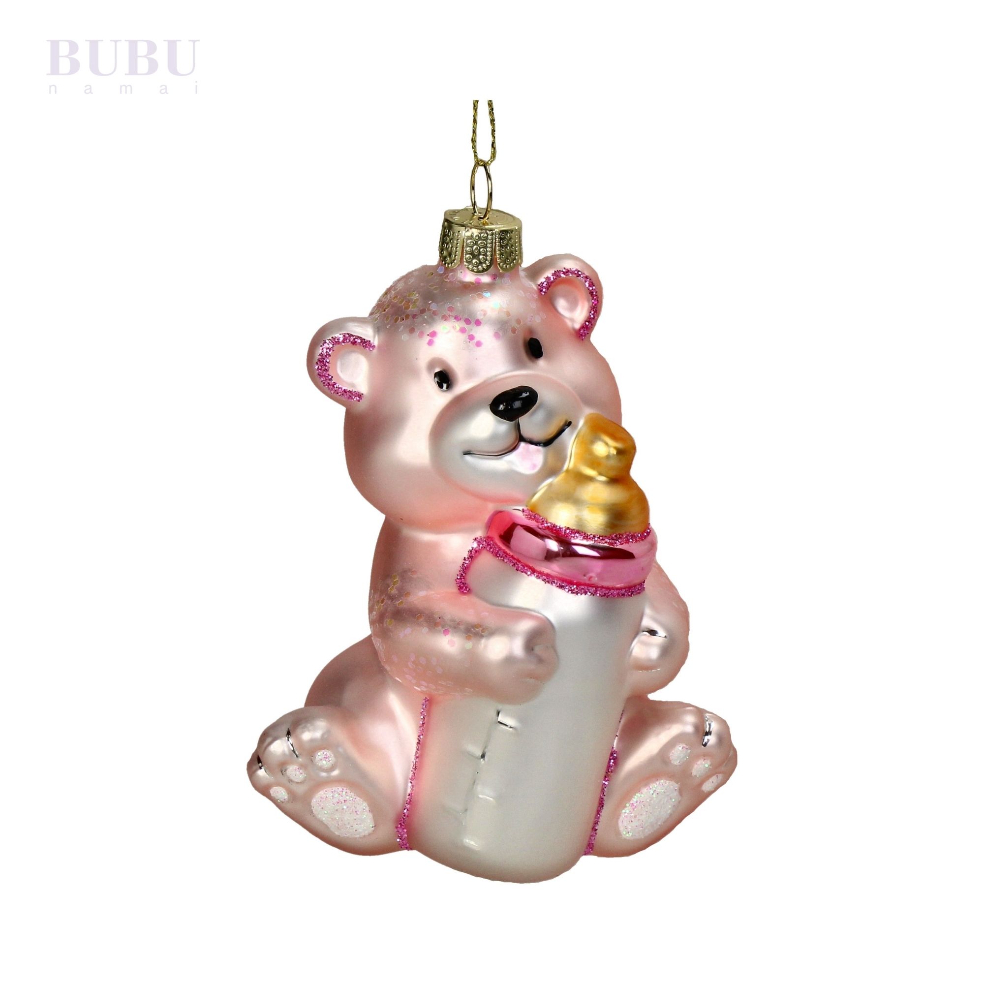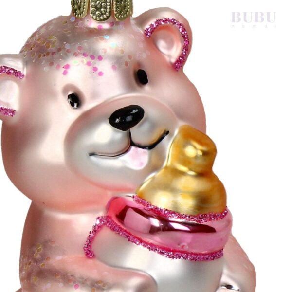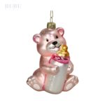 Šis mielas stiklinis eglutės žaisliukas vaizduoja rožinį meškiuką, laikantį kūdikio buteliuką. Blizgūs rožiniai akcentai ir švelni spalvų paletė suteikia dekoracijai šilumos bei jaukumo.