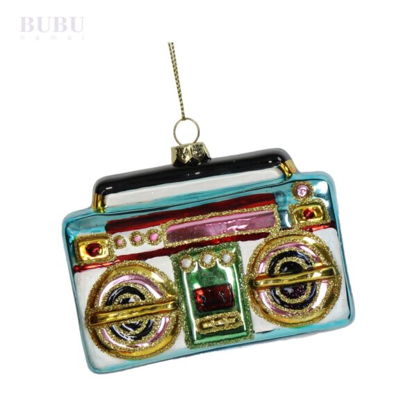 Šis spalvingas stiklinis ornamentas traukia akį retro magnetofono forma, ryškiomis spalvomis ir blizgiais akcentais. Žaismingas dizainas suteikia jam išskirtinio charakterio ir paverčia eglutę stilingu šventės akcentu. Muzikos mėgėjai, apsilankę Bubunamai, atras, kad ši dekoracija puikiai įneša linksmos nuotaikos ir originalumo į šventinį interjerą.