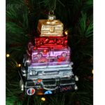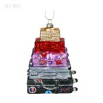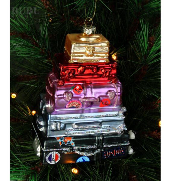 Spalvingas stiklinis Kalėdų eglutės žaisliukas lagaminų bokšto formos – originali dekoracija, simbolizuojanti kelionių džiaugsmą ir nuotykius. Įvairių spalvų lagaminai su smagiomis detalėmis suteikia žaismingumo bei išskirtinumo.
