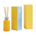 Ryškus ir gaivus stiklinis kvapų difuzorius, kuriame dera saulėta geltona ir švelni mėlyna spalvos, suteikiančios interjerui energijos ir žaismingumo. Blizgus stiklinis indas su dekoratyviniu žiedu ir natūraliomis lazdelėmis tampa ne tik kvapo, bet ir stilingu namų akcentu.