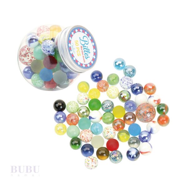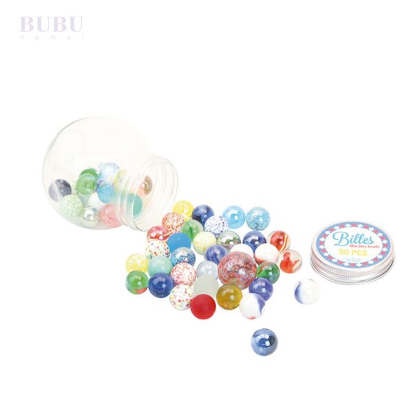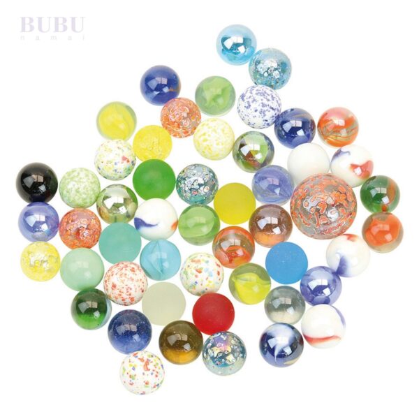 • 50 spalvingų stiklinių rutuliukų – įvairių raštų, spalvų ir dydžių.
