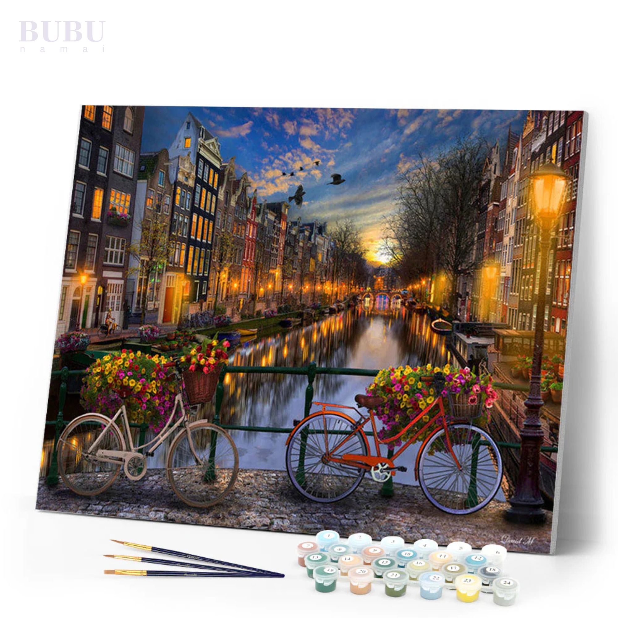 Atraskite Europos žavesį su šia įspūdinga tapyba pagal skaičius iš Bubunamai! Paveiksle pavaizduotas romantiškas Amsterdamo vakaras – gėlėmis papuošti dviračiai, apšviesti kanalai ir jaukios, istorinių pastatų gatvelės. Šiltos gatvių šviesos atsispindi vandenyje, sukurdamos ypatingą miesto magijos ir ramybės atmosferą.
