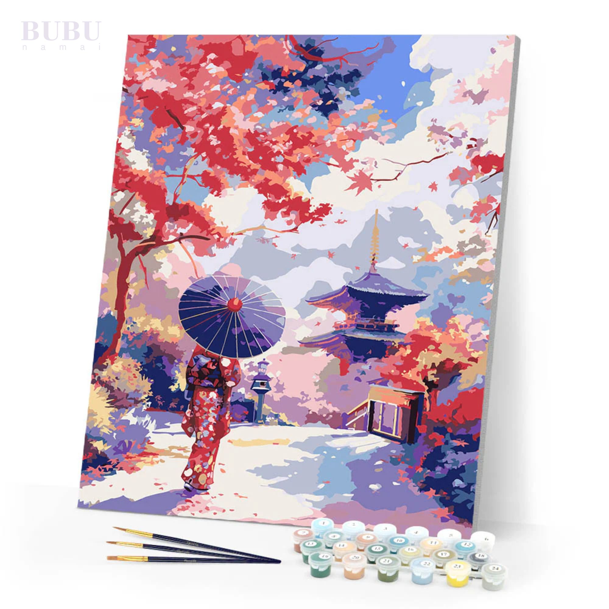 Šis elegantiškas tapybos pagal skaičius paveikslas nukelia į ramybės ir estetikos kupiną Japonijos sodą. Kompozicijoje vaizduojama moteris su tradiciniu skėčiu, žingsniuojanti tarp ryškiaspalvių rudens medžių, o fone iškyla subtili pagoda. Švelnios pastelinės spalvos, krintantys lapai ir harmoningas peizažas sukuria meditacinę, jaukią atmosferą.