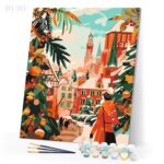 Pasinerkite į šventinę nuotaiką tapydami šį spalvingą žiemos miesto vaizdą! Paveiksle vaizduojamas jaukus miestelis, pasipuošęs kalėdinėmis dekoracijomis, sniegu padengti stogai ir praeiviai, besimėgaujantys žiemos magija. Ryškios raudonos, žalios ir auksinės spalvos kuria šilumos ir džiaugsmo atmosferą.