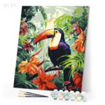 Šis ryškus ir egzotiškas paveikslas nukelia į vešlias tropines džiungles, kur tarp sodrios žalumos ir spalvingų žiedų puikuojasi didingas tukanas. Jo įspūdingas, spalvingas snapas ir kontrastingos plunksnos sukuria energingą, gyvybės kupiną kompoziciją, kuri iškart patraukia akį.