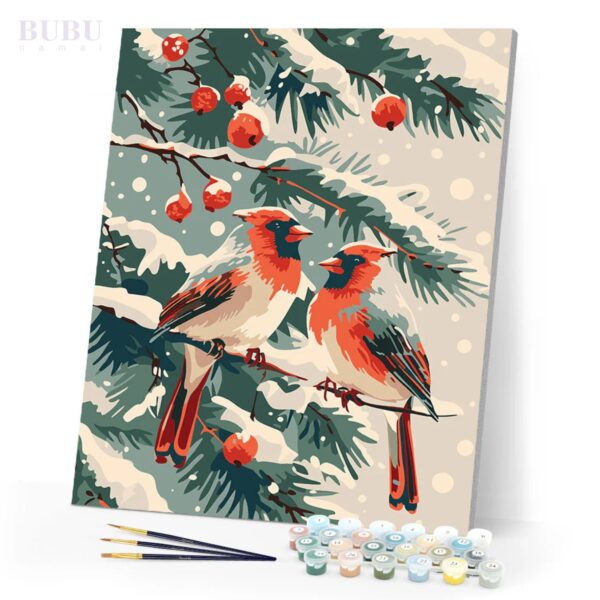 Pasinerkite į žiemos ramybę su šiuo tapybos pagal skaičius rinkiniu. Ant drobės vaizduojami du ryškiaspalviai paukščiai, nutūpę ant apsnigtos eglės šakos tarp raudonų uogų. Tai jaukus ir šventiškas paveikslas, kuris leis atsipalaiduoti, mėgautis kūrybos procesu bei sukurti unikalų meno kūrinį savo namams. Bubunamai – puiki idėja šventinei dovanai arba šiltai žiemos interjero detalei.