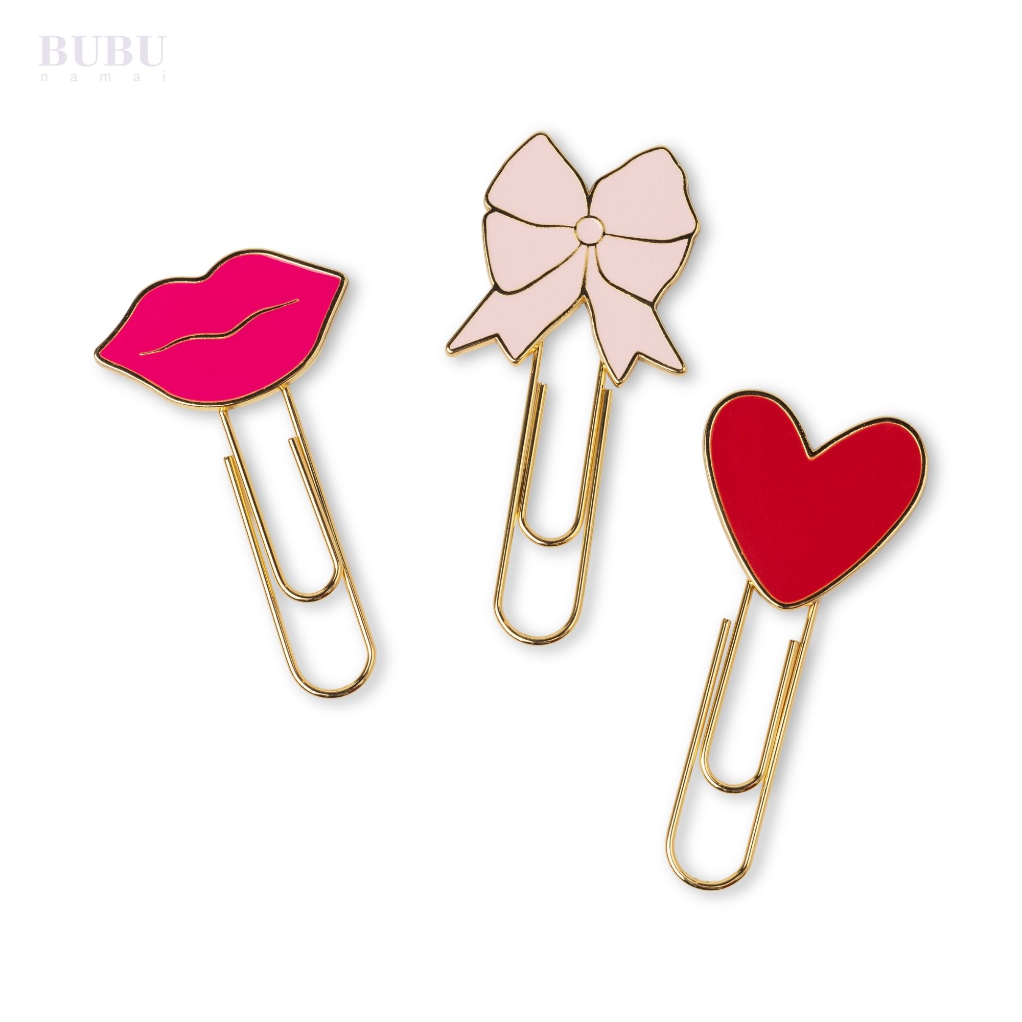 Žaismingas ir stilingas trijų dekoratyvinių sąvaržėlių rinkinys, kuris suteiks romantikos ir žavesio kasdieniams darbams. Širdelės, lūpų ir kaspino formos su auksinės spalvos detalėmis paverčia šias sąvaržėles ne tik praktišku, bet ir akį traukiančiu aksesuaru.