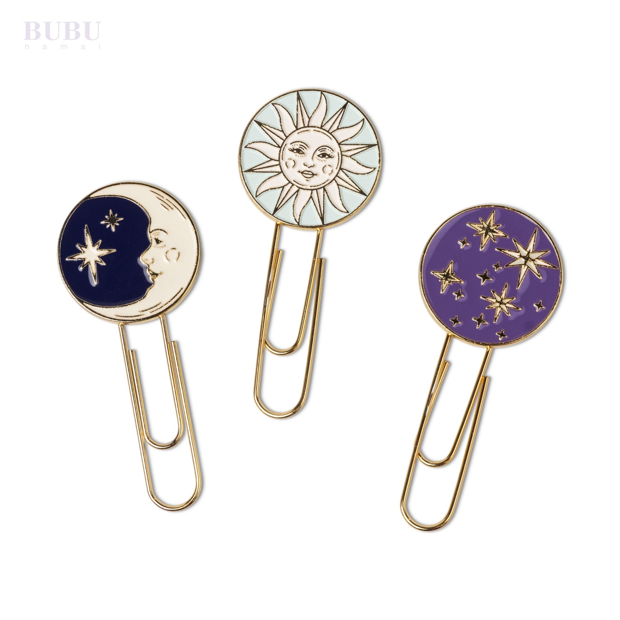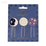 Mistiškas ir elegantiškas trijų dekoratyvinių sąvaržėlių rinkinys, įkvėptas dangaus kūnų simbolikos. Mėnulio, saulės ir žvaigždžių motyvai su auksinės spalvos detalėmis sukuria paslaptingą, kosminę nuotaiką ir išskirtinį dizainą.