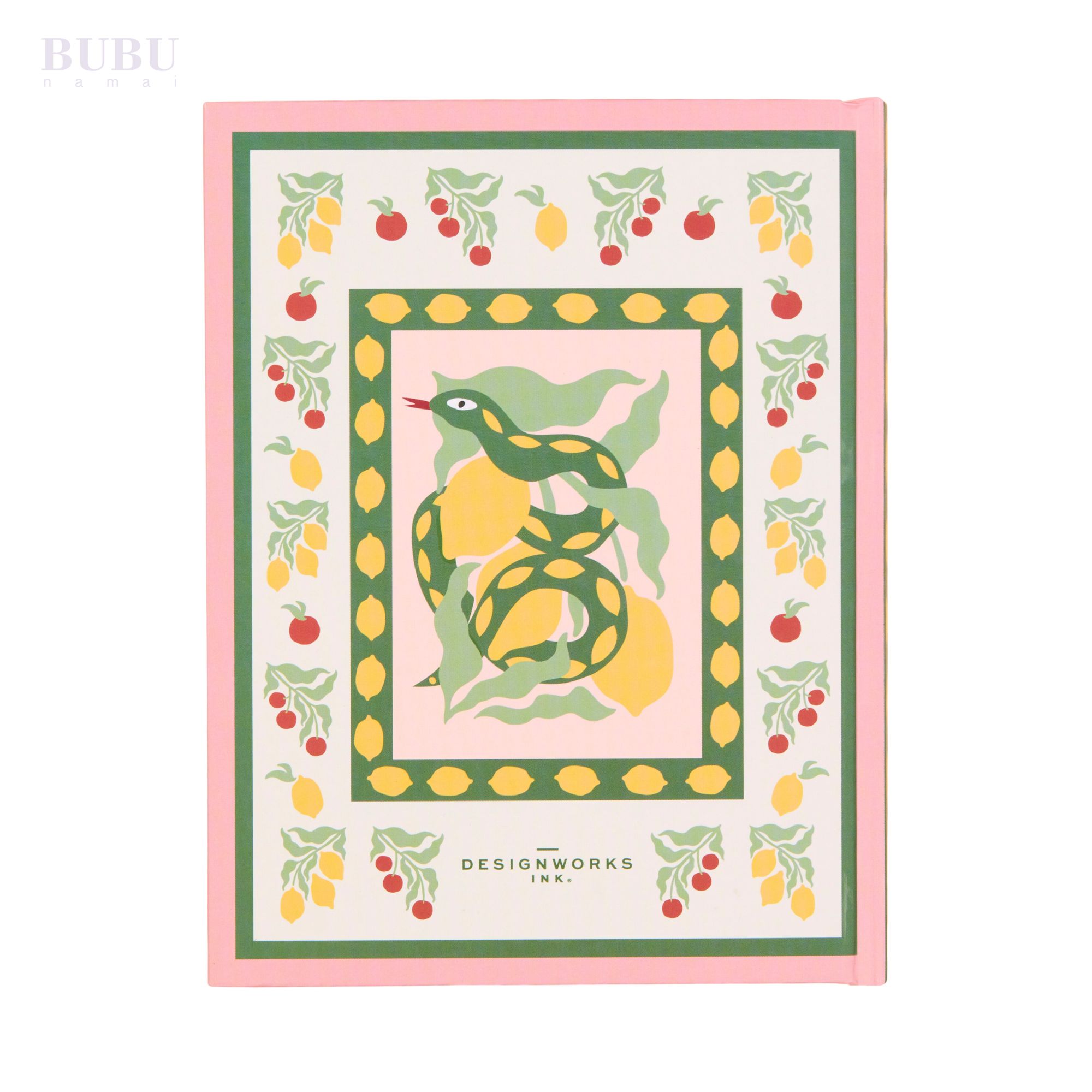 Ryški ir išskirtinio dizaino užrašinė, dekoruota stilizuota gyvate, apsivijusia aplink citrinas — netikėtas ir žaismingas derinys, dvelkiantis Viduržemio jūros estetika. Rožiniai, geltoni ir žali tonai sukuria gaivią, vasarišką nuotaiką, o dekoratyvinis rėmelis su citrinų ir vyšnių šakelėmis suteikia užrašinei harmoningą, rankų darbo iliustracijų pojūtį.